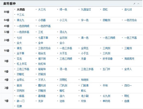 这个分类实在太多,可以参照以下链接和表格( 《中国麻将竞赛规则 》):http://baike.baidu.com/view/1955385.htm
